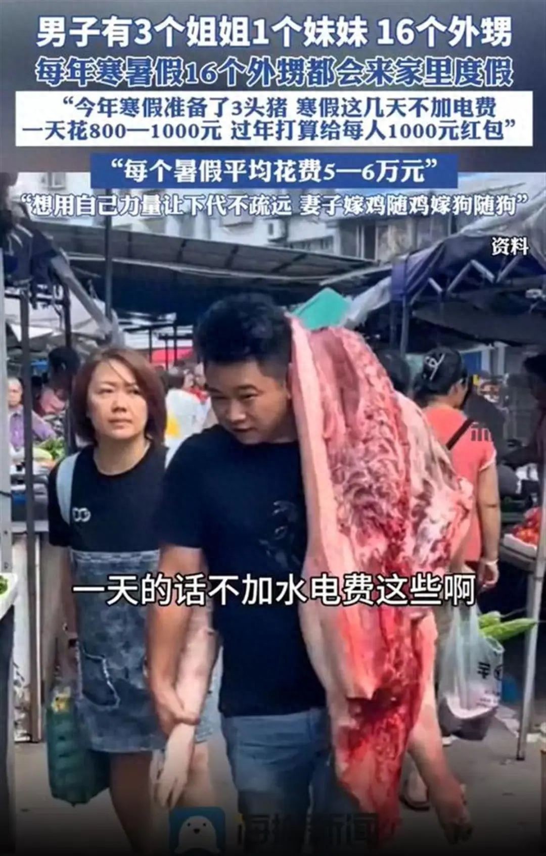 据海报新闻1月16日报道,重庆的龚先生有三个姐姐一个妹妹,一共16个外甥。每年的寒暑假外甥们都会来家里度假,今年寒假准备了3头猪,寒假这几天不算水电费,一天要花千儿八百元,过年打算给每人1000元红包。他说:“那种快乐是很多人体会不到的,我不想让下一代疏远了。”